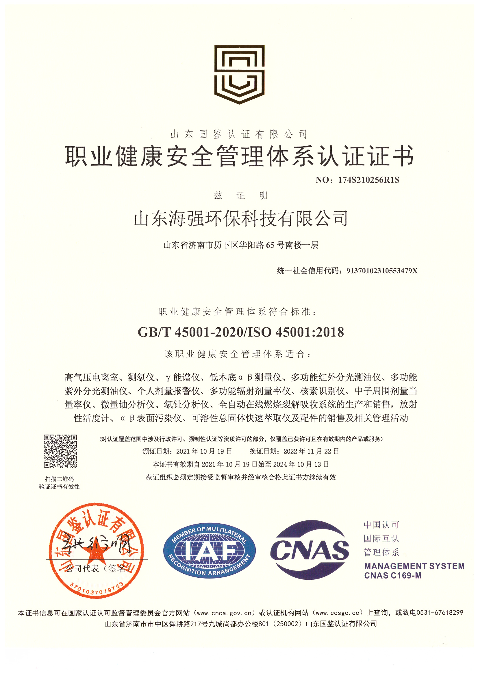 職業健康安全管理體系認證證書
